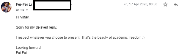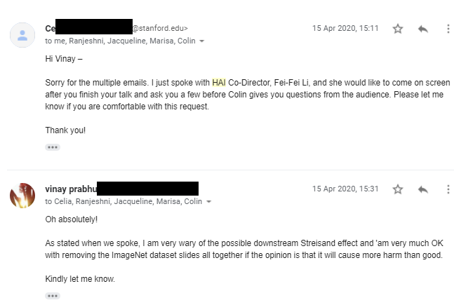 Proof : The paper that we published heavily draws from my talk “On the four horsemen of ethical malice in peer reviewed machine learning literature” given under the aegis of the Stanford-HAI weekly seminars (thanks to an invite from Colin Kelley Garvey, an AI ethicist) on April 17, 2020–11:00am–12:00pm. On Apr 15th, I received this email from a HAI co-ordinator stating that “ I just spoke with HAI Co-Director, Fei-Fei Li, and she would like to come on screen after you finish your talk and ask you a few before Colin gives you questions from the audience. Please let me know if you are comfortable with this request ”.