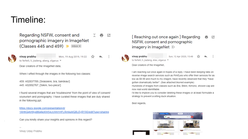 Pre-script : The authors of the paper Large image datasets: A pyrrhic win for computer vision?, (and this blog-post you are reading), are abbreviated as VP (Vinay Prabhu) and AB (Abeba Birhane) respectively in the rest of the material presented here. PL refers to the main visionary of the ImageNet dataset. Wherever relevant, ‘ Our paper ’ refers to Large image datasets: A pyrrhic win for computer vision?__ and ‘ their paper ’ refers to __A Study of Face Obfuscation in ImageNet_ _.